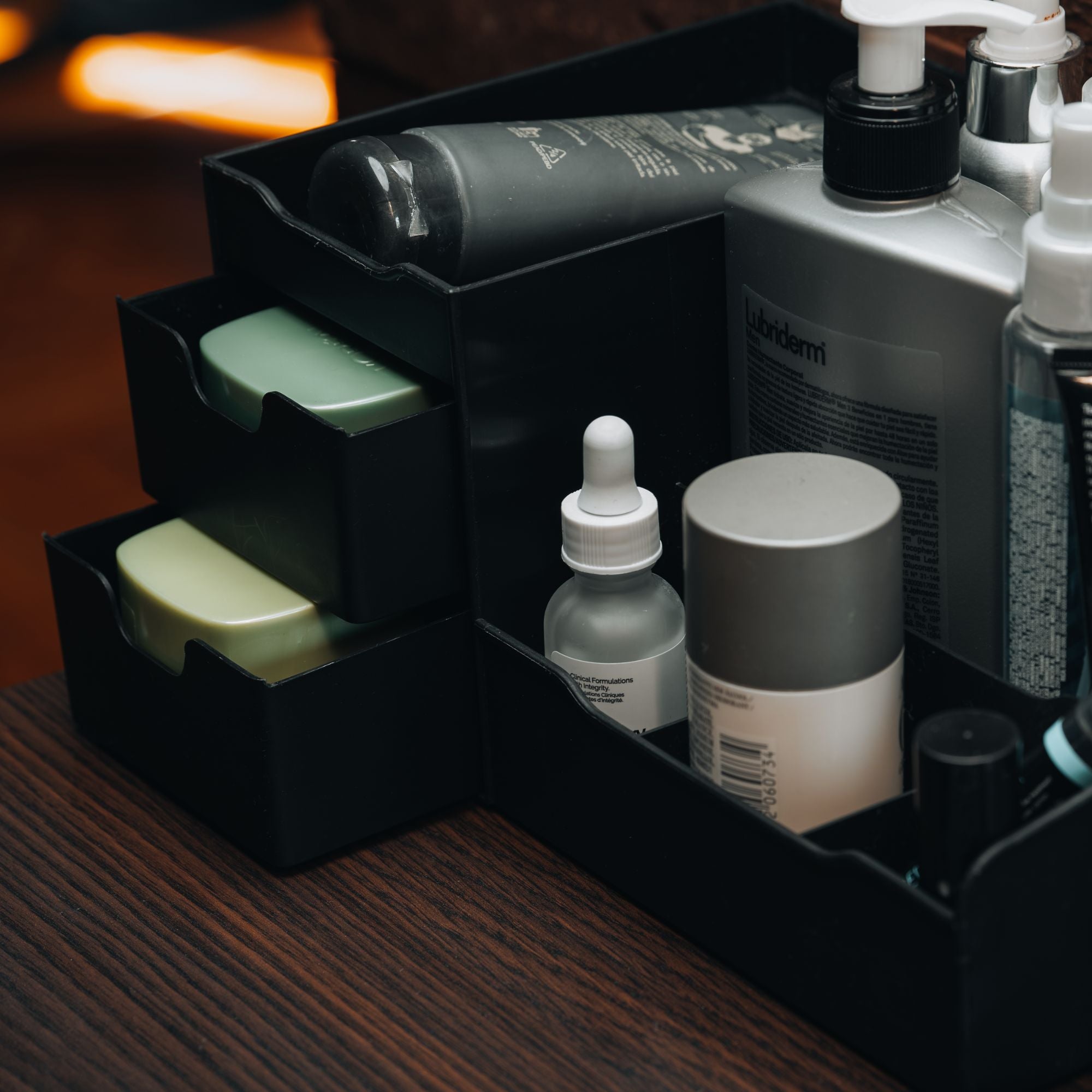 Different sized slots and deep drawers make it easy to fit all your items and see them at a glance. Everyone has their own stuff to unclutter. We designed our grooming box with structures and spaces to fit all your unique uncluttering needs.
