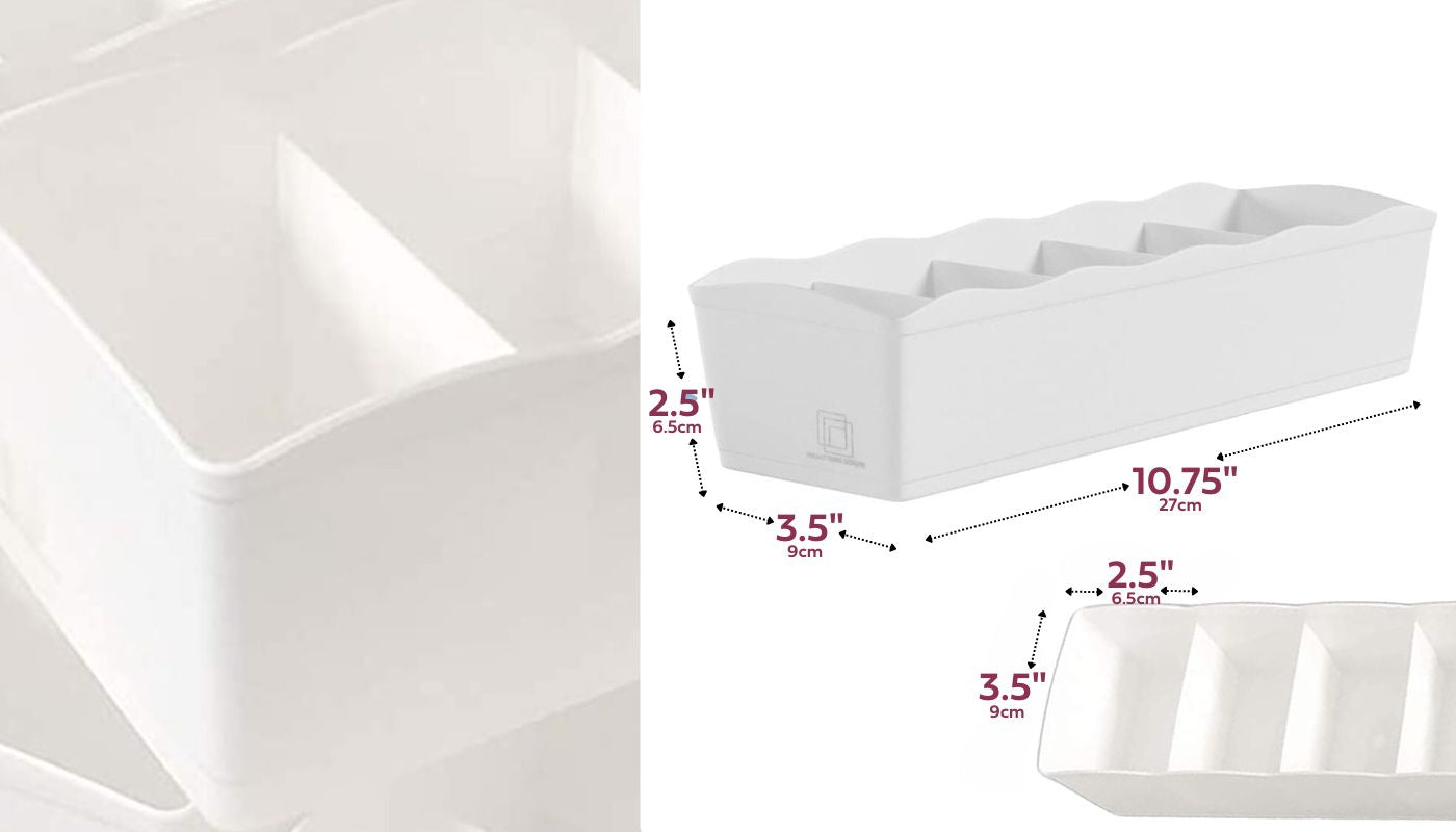 Stiff slots fit all your items so you can see everything you have at a glance. Organize your chaos once and for all! You'll receive a set of FIVE sturdy, washable organizing boxes of 10.75" x 3.5" x 2.5" (27 x 9 x 6.5cm) with 5 grid partitions each of 3.25" x 2.25" (8 x 6cm)