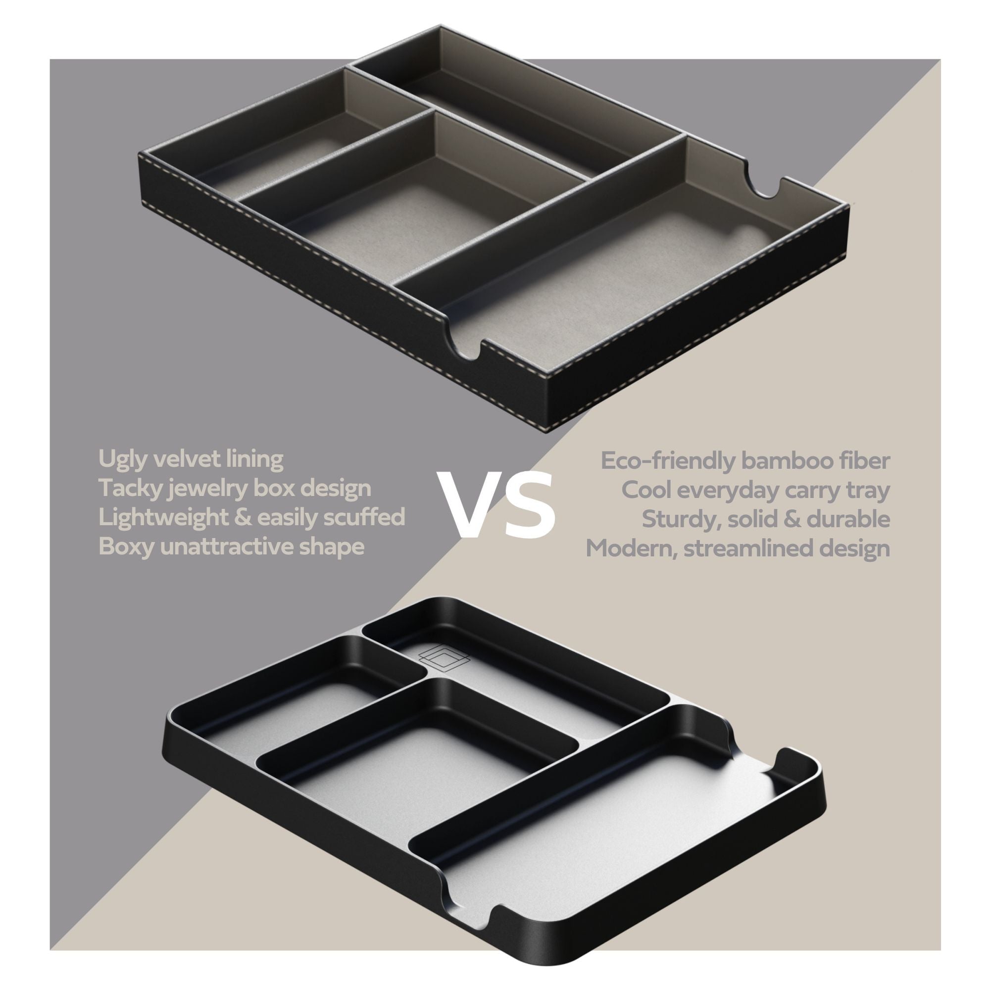 Ecological bamboo fiber is a sustainable alternative to those other tacky fake velvet and faux leatherette PVC trays out there. Better than environmentally damaging plastics, bamboo fiber makes a minimal impact on the environment so you can feel good about your organizing choices.
