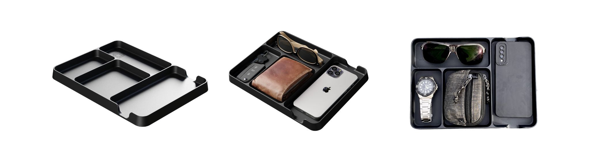 Ditch your gear and liberate your pockets. You know all that stuff you carry around every day in your pockets and then just toss on the counter? We've created a slick home for it. Our organization tray provides the perfect storage solution for your mobile phone, glasses, car keys, house keys, headphones, airpods, wallet, money clip, coins and more.