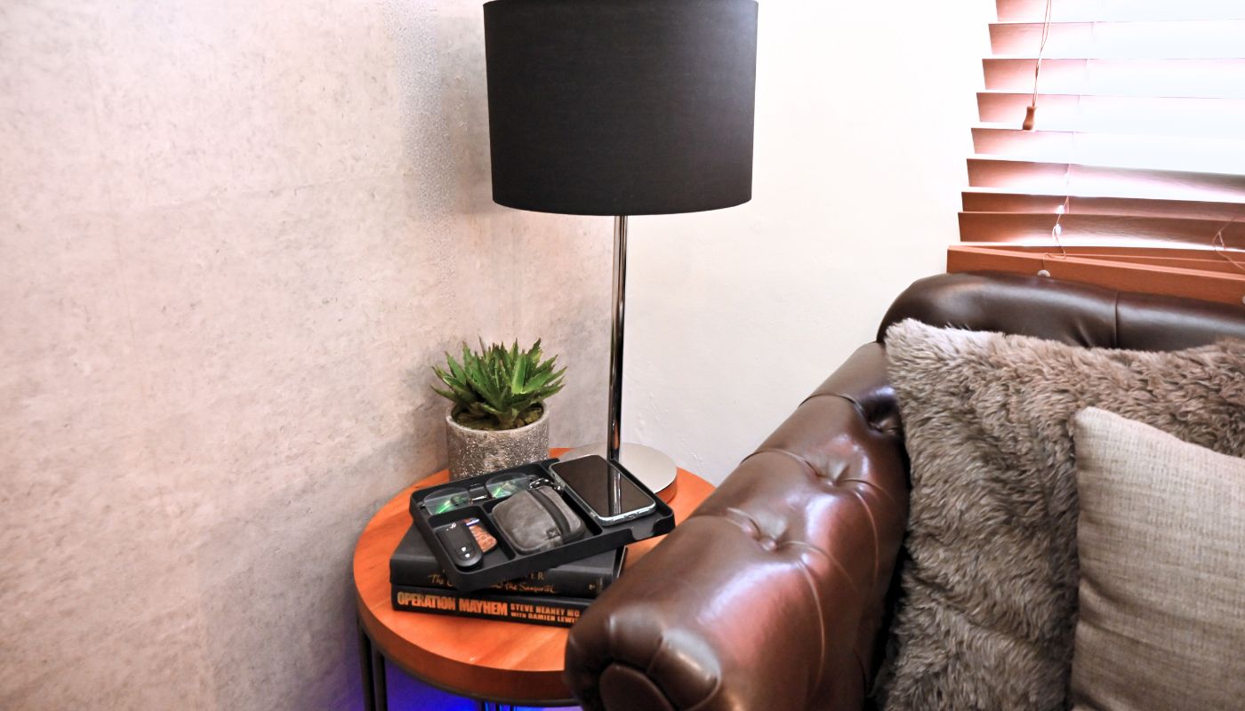 The clean, modern lines of this black storage tray suit your sleek home decor. Nothing velvet or tacky. This is not a repurposed jewelry organizer. It's a clean, thick, sturdy bamboo fiber catchall tray with a good weight to it that fits your style. Perfect as a key drop station in your hall entrance way, a bedside caddy, a desk organizer or an office accessory. Not to mention the ultimate modern black nightstand organizer for men. Also great as a remote control holder, cell tray & charging station by the TV. Tidy device management.