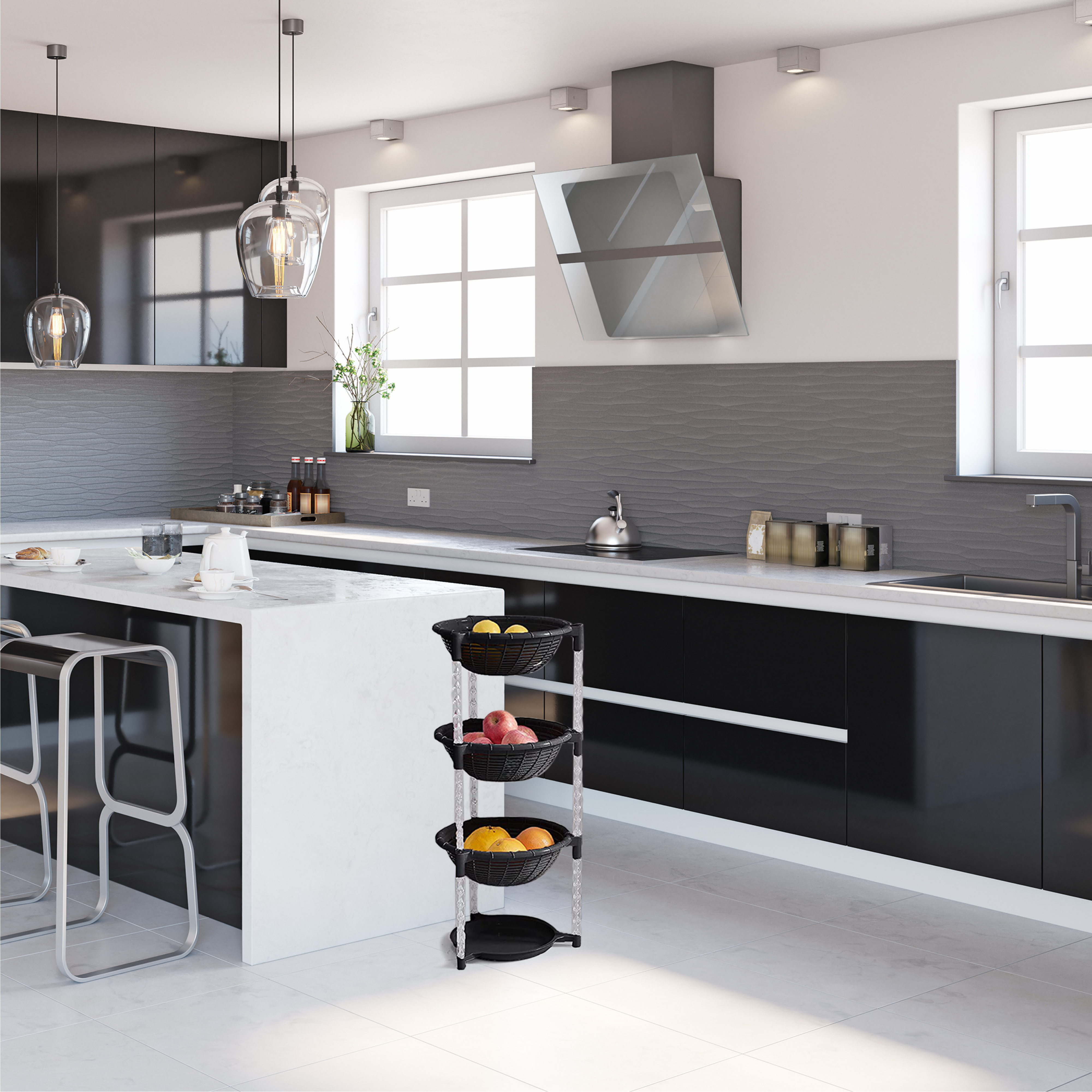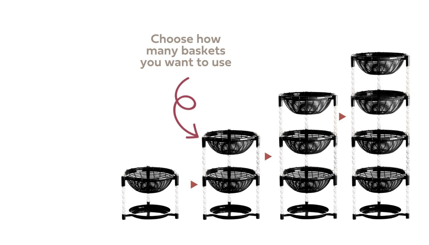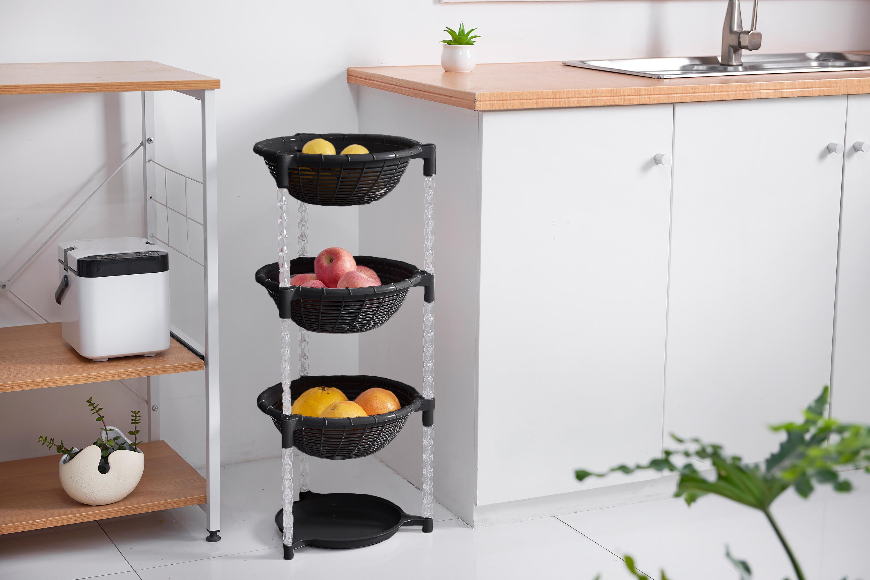 THREE sturdy, chic baskets from robust plastic. ONE flat plate with a curved edge. Perfect for items you want to keep flat. Attractive transparent legs in between each layer.
