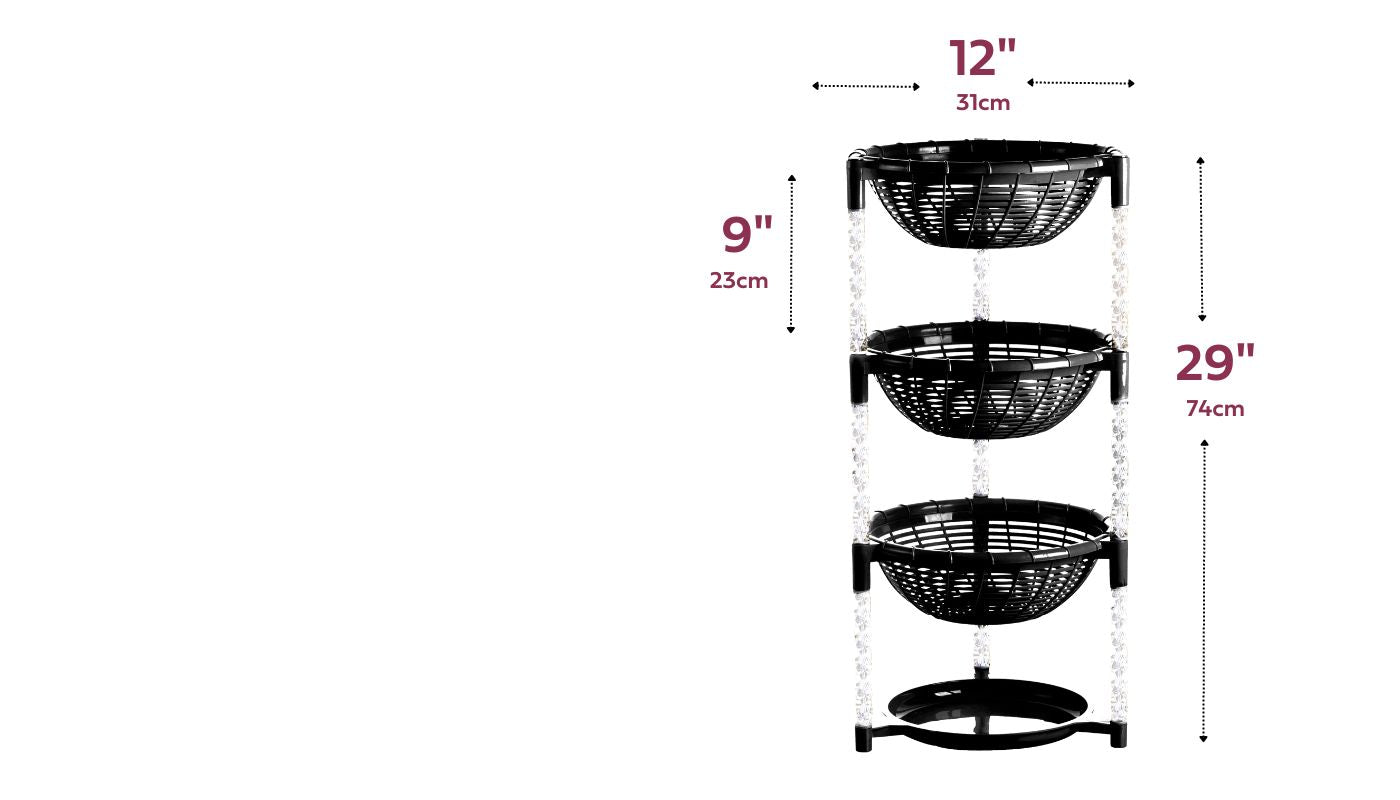 Each basket is 12" across (31cm) by 4" tall (10cm). Each layer is 9" high (23cm).The entire unit is 29" high (74cm).
