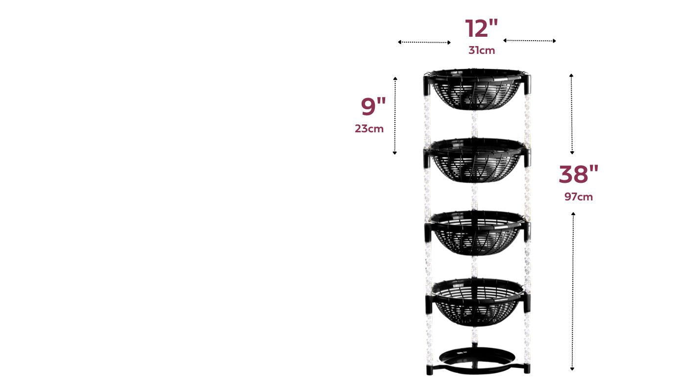 Each basket is 12" across (31cm) by 4" tall (10cm). Each layer is 9" high (23cm).The entire unit is 38" high (97cm).